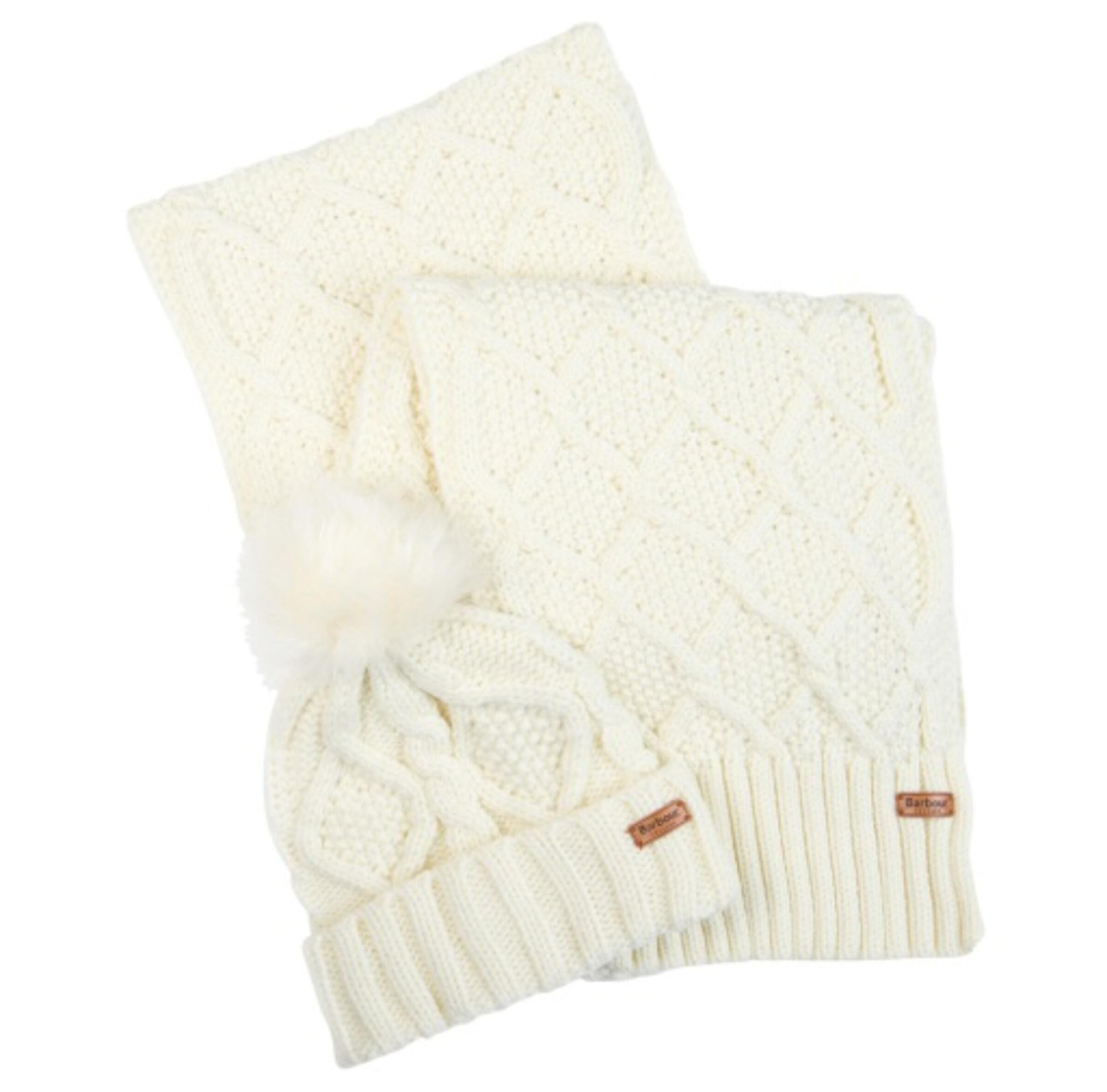 Barbour International Mallory beanie and scarf White knit and faux fur 50% viscose, 32% polyester, 18% polyamide Hat: faux fur pompom, designer plaque, ribbed trims. Scarf: designer plaque Hand wash. Color: natural