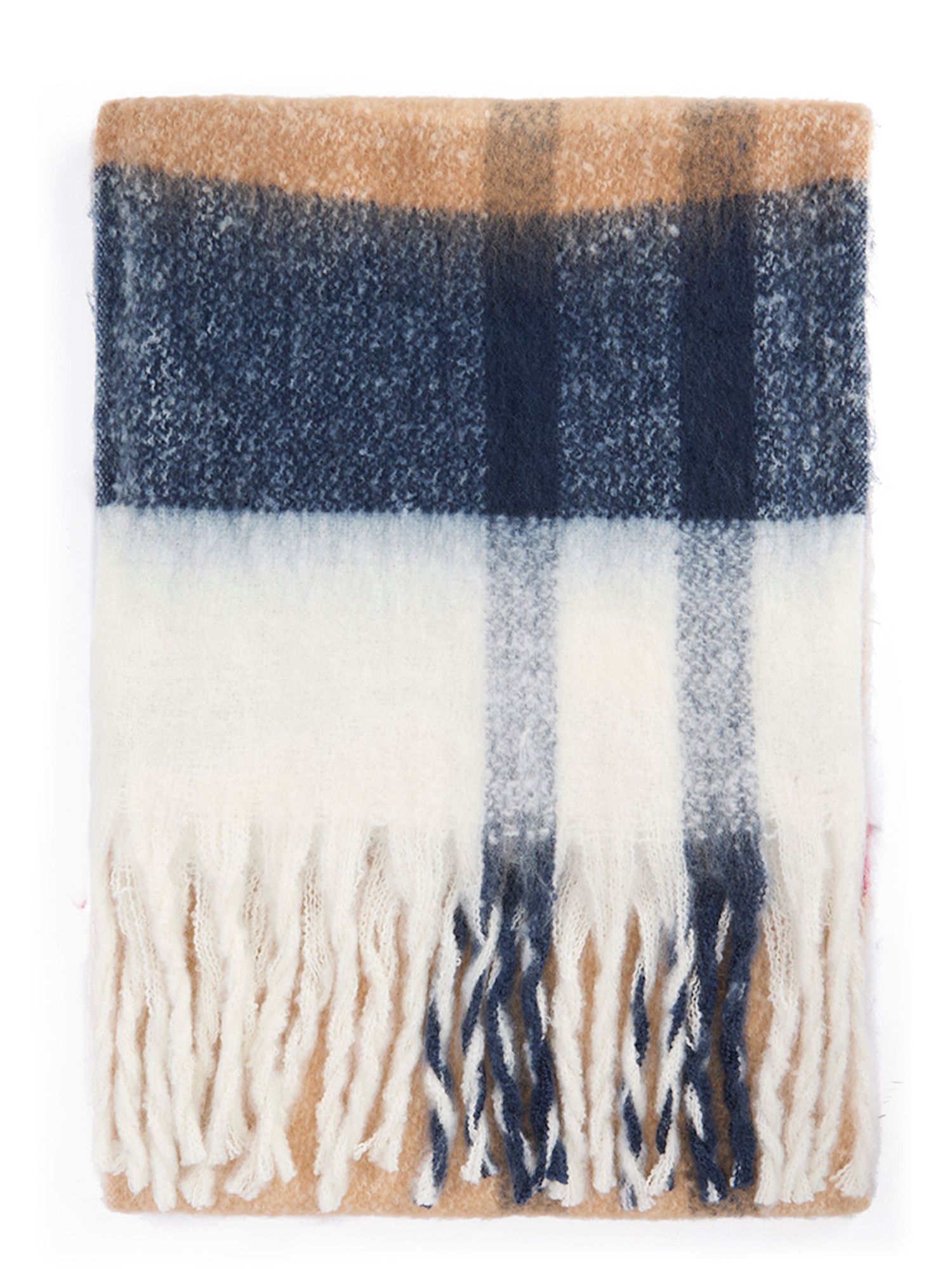 Felted effect abstract tartan scarf with an XL twisted tasselled hem edge.
