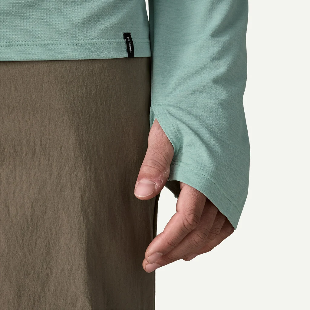 Thumb holes at the cuffs provide added sun protection for the backs of hands
